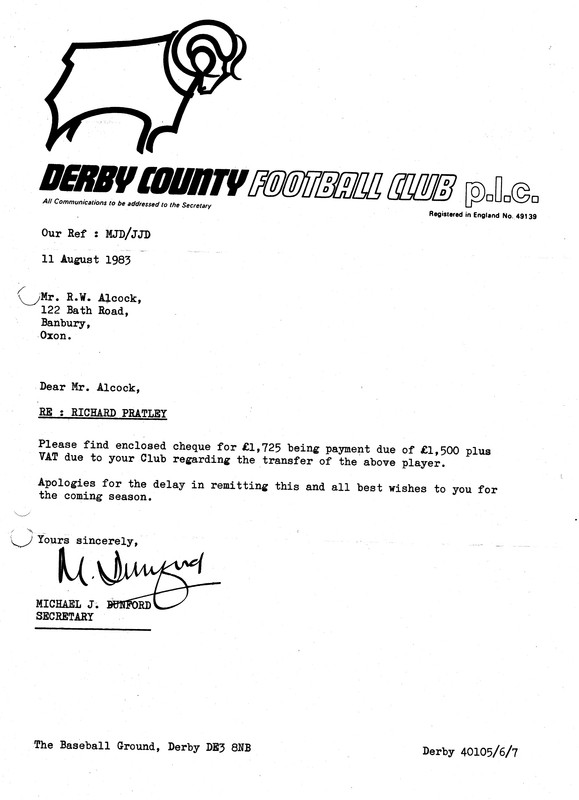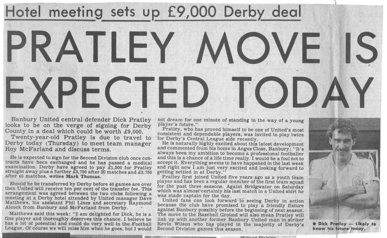 A recently discovered press cutting and other documentation dug out from club files ref transfer of Dick Pratley to Derby County in 1983